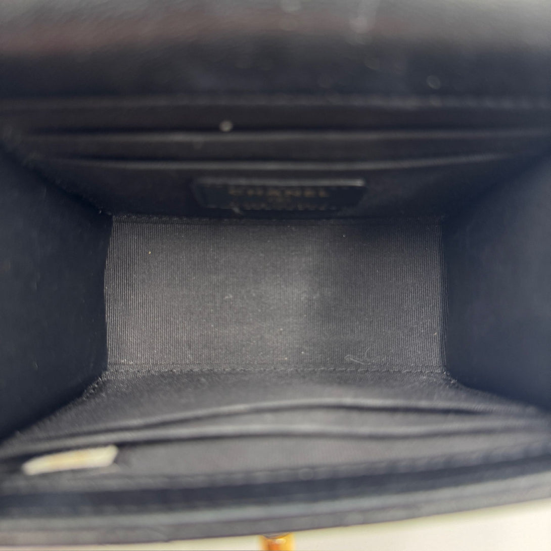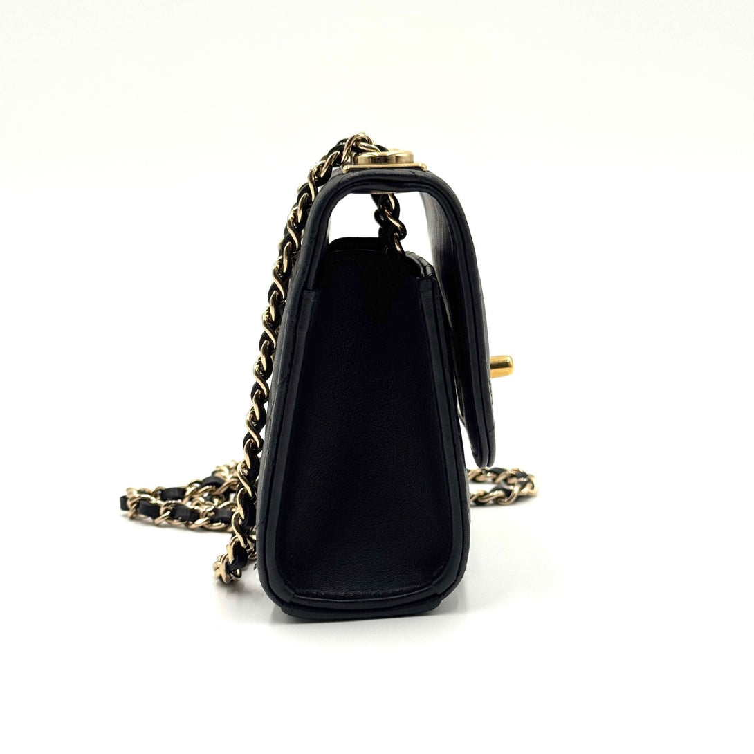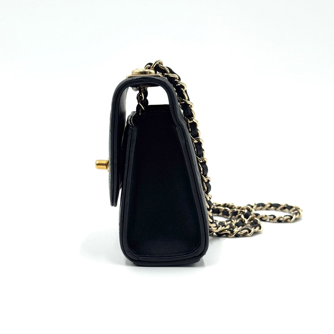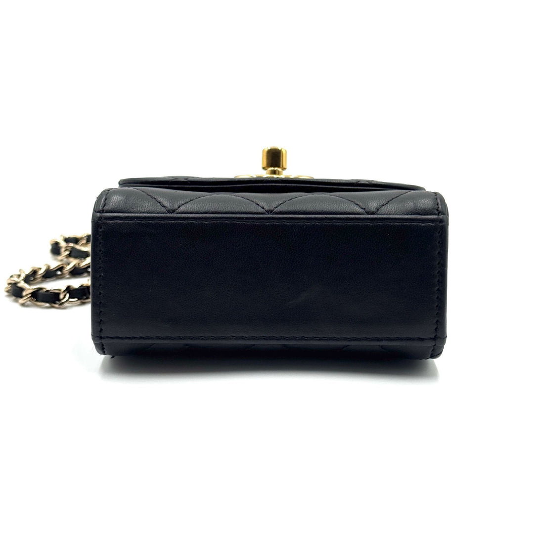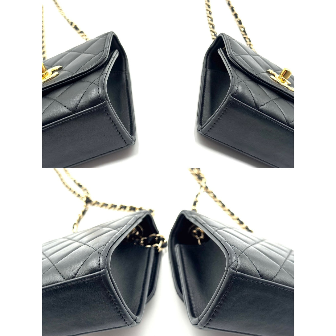 Crafted from luxurious lambskin leather, this Chanel mini handbag features a timeless quilted design, gold-tone chain strap, and iconic CC logo, exuding elegance.
