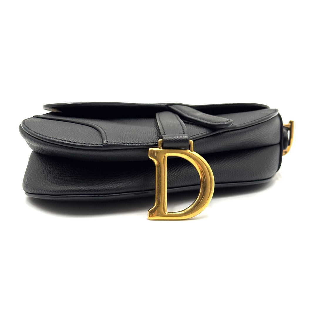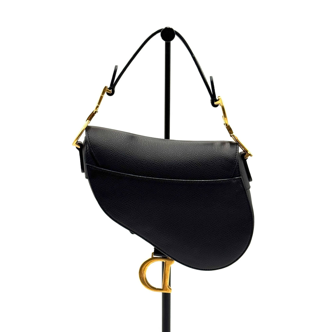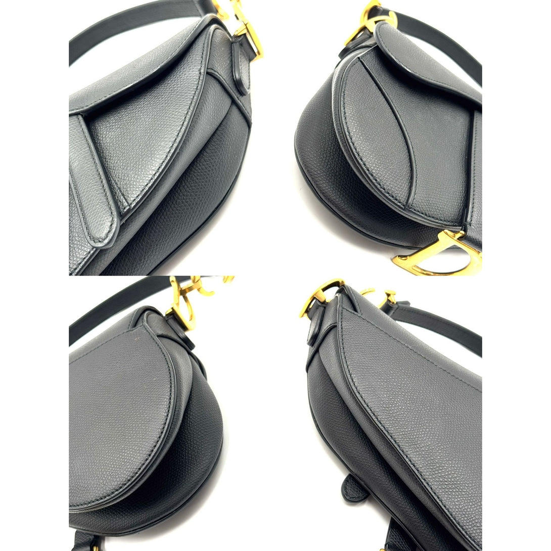 A classic Christian Dior saddle bag in black grained leather with gold-tone hardware, featuring the iconic 'CD' and 'D' embellishments, and a timeless silhouette.