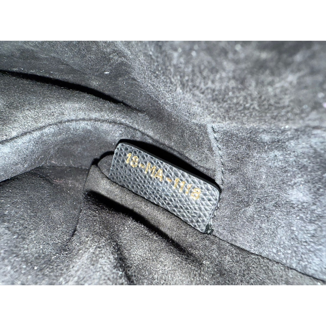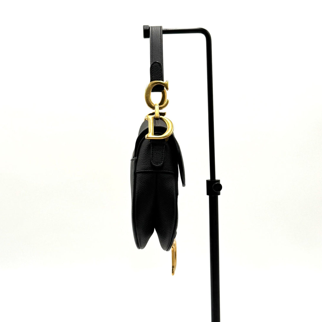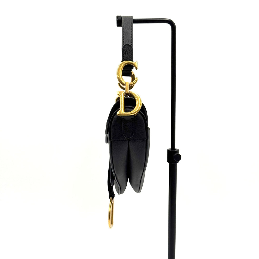 A classic Christian Dior saddle bag in black grained leather with gold-tone hardware, featuring the iconic 'CD' and 'D' embellishments, and a timeless silhouette.