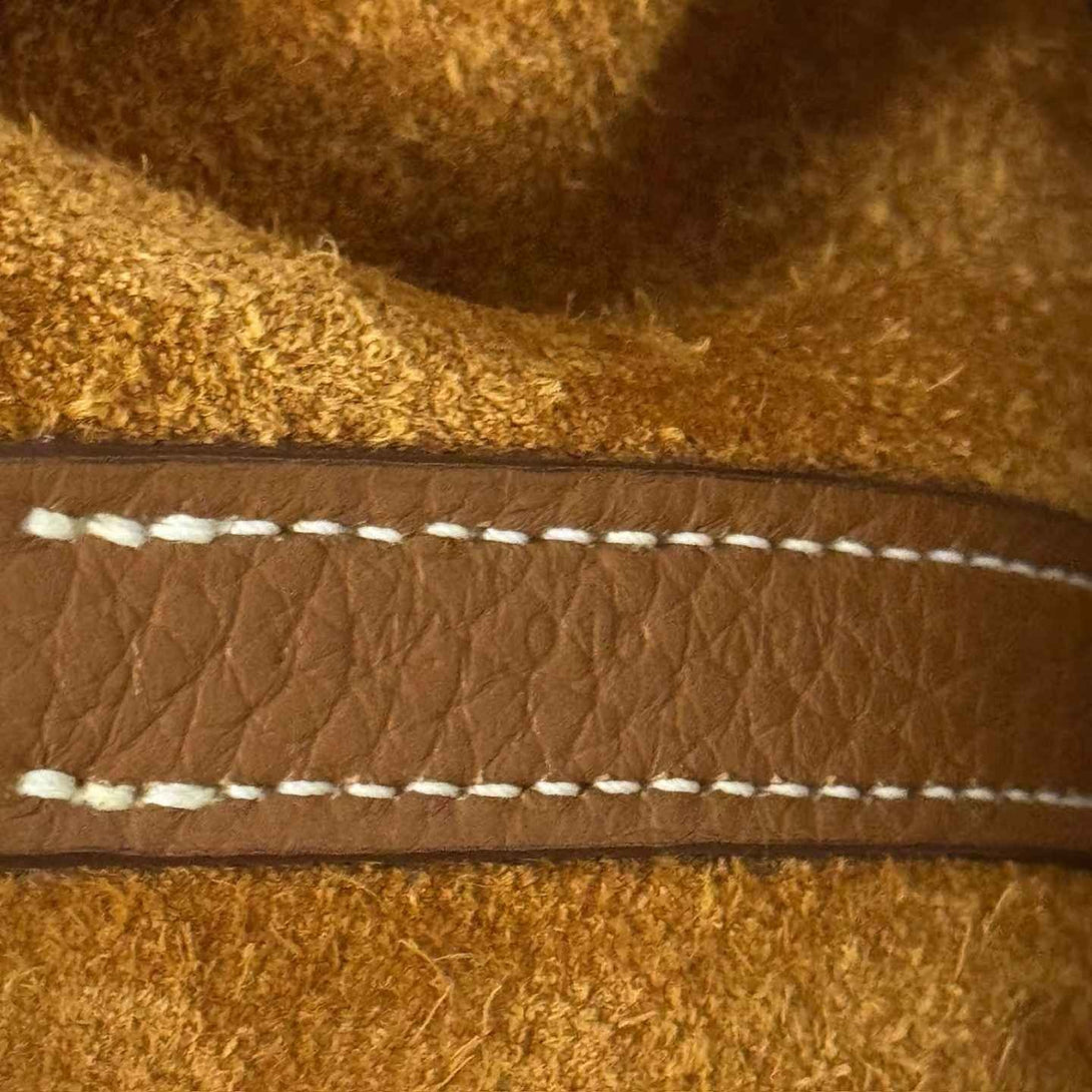 This is an authentic HERMES Taurillon Clemence Picotin Lock 18 PM in Gold. This chic tote is crafted of textured Clemence calfskin leather in brown. This bucket-style bag features a unique one-piece reinforced design with leather top handles and a closure strap that can be secured by a polished palladium padlock. This opens to a brown suede interior.