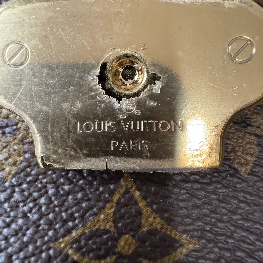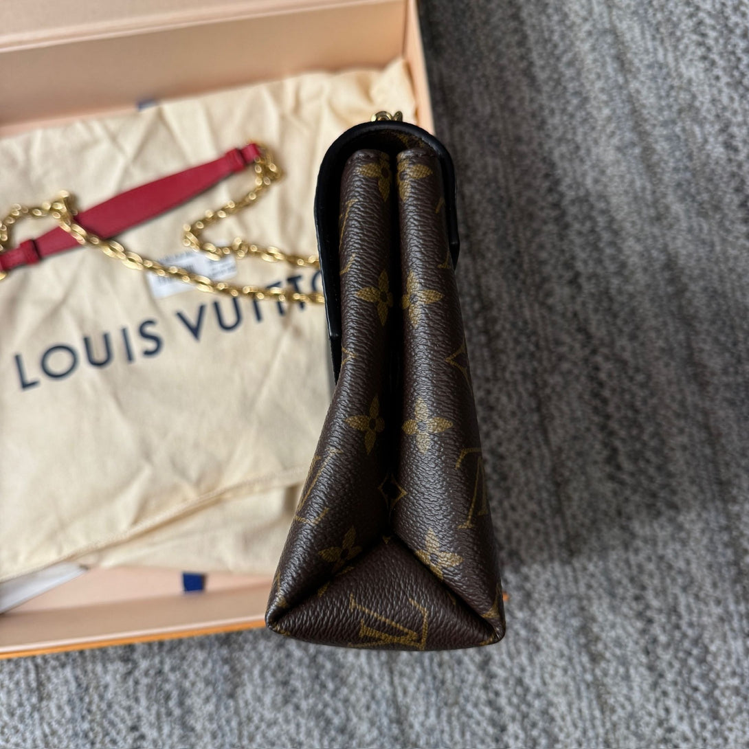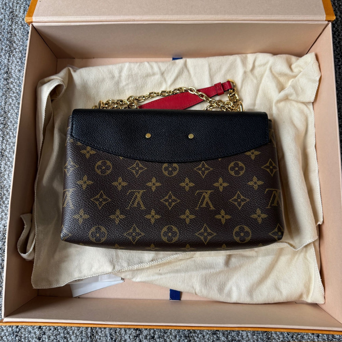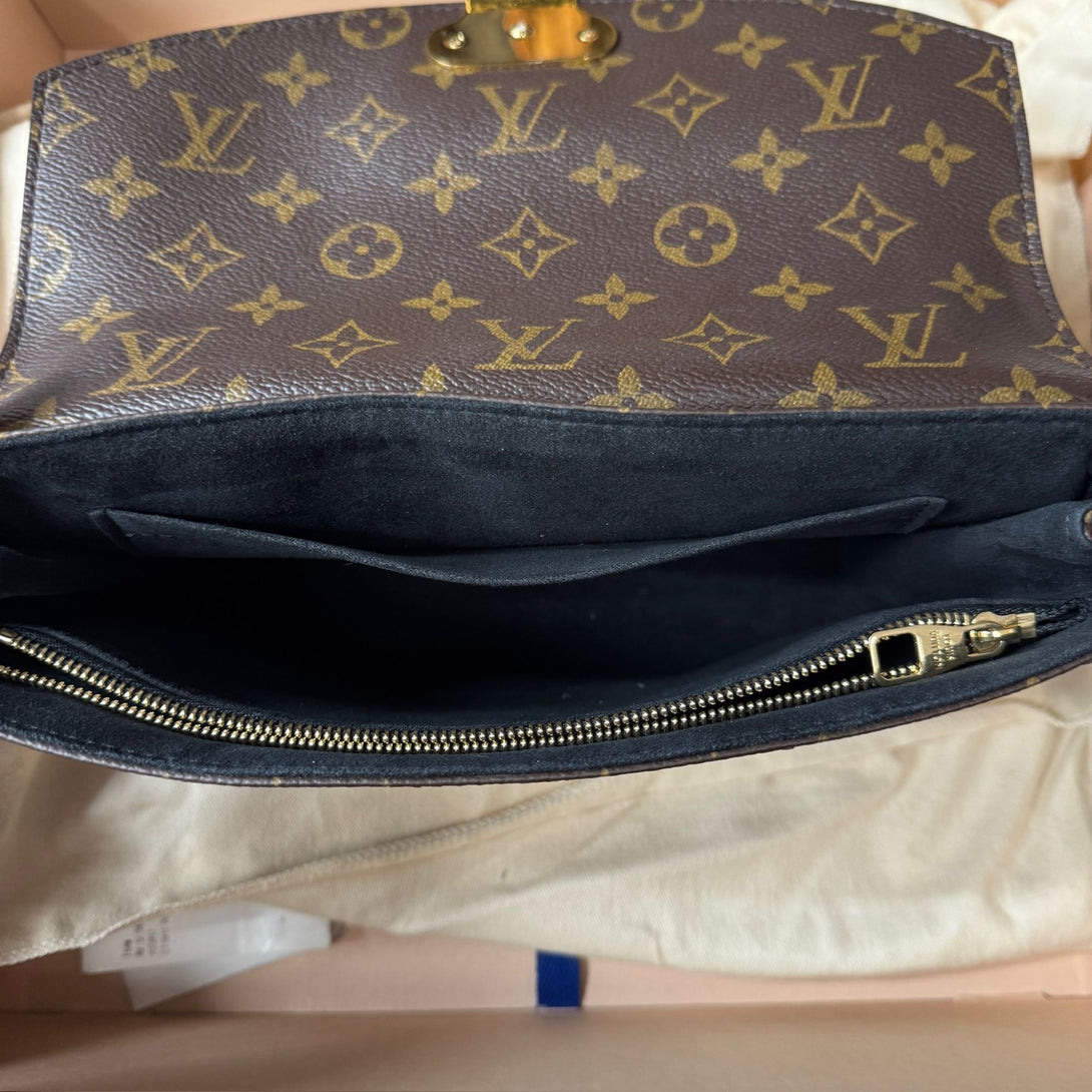 This is an authentic LOUIS VUITTON Monogram Saint Placide in Black. This chic handbag is crafted of Louis Vuitton monogram on toile canvas, with a front flap of black calfskin leather. The bag features a golden clasp borrowed from historic House trunks flap closure and a matching chain-link shoulder strap with a red leather shoulder pad. The flap opens to a black microfiber interior with a zipper compartment and a patch pocket.