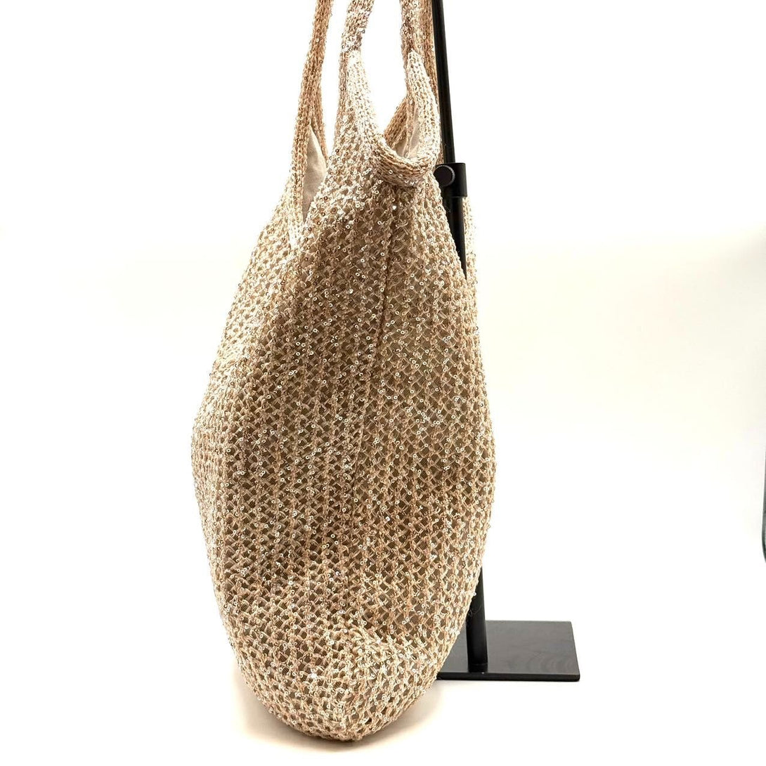 This Miu Miu sequin mesh tote bag combines functionality with sophistication. Its spacious design and lightweight material make it suitable for carrying daily essentials.